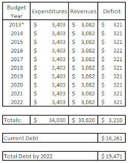 Let’s now take a look as to how this all plays out. The following figures are simple linearly-extrapolated numbers based on the conditions we know currently exist in the 2013 budget: