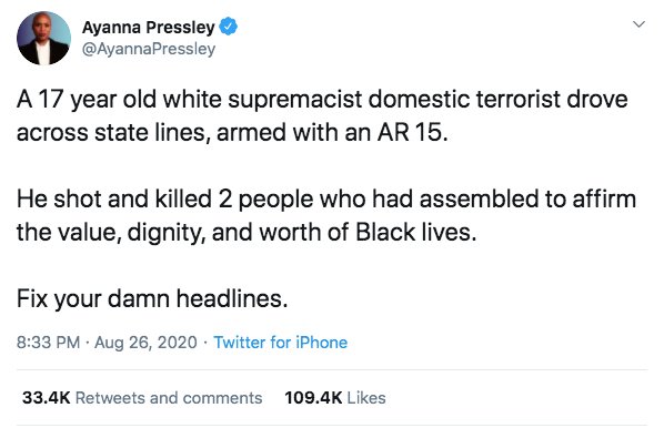 “A 17 year old white supremacist domestic terrorist drove across state lines, armed with an AR 15,” Pressley wrote on Twitter. “He shot and killed 2 people who had assembled to affirm the value, dignity, and worth of Black lives.”