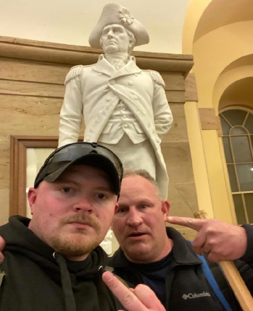The officers were photographed making an obscene gesture in front of a statue in the Capitol building, according to a criminal complaint against them.
