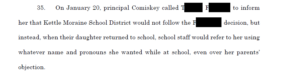 On Jan. 20, the principal informed the parents “when their daughter returned to school, school staff would refer to her using whatever name and pronouns she wanted while at school, even over her parents’ objection,” the complaint said. The parents then promptly pulled their daughter from the Kettle Moraine School District.