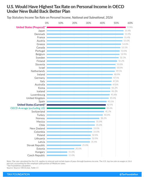 “Raising the top marginal tax rate on ordinary income to the highest in the OECD will damage U.S. competitiveness,” Tax Foundation analysts Alex Durante and William McBride warn. “It will also reduce incentives to work, save, invest, and innovate, with broad implications for the U.S. economy.”