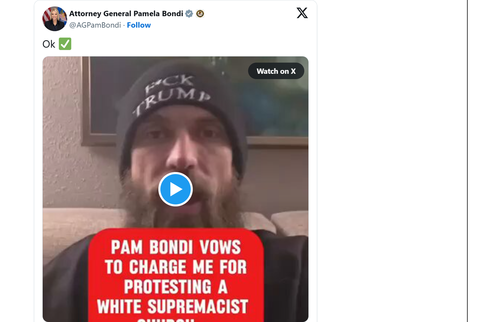 “So, you know, Pam Bondi, you want to come and arrest me? You want to come and give me charges? So be it,” Kelly previously said in a video interview after the Sunday protest.
