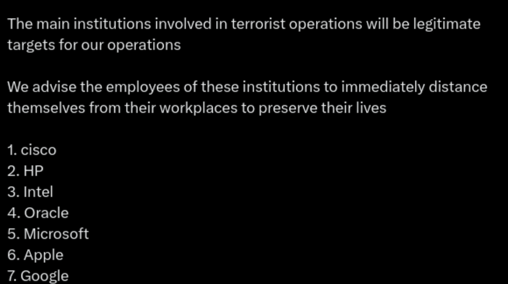 “The main institutions involved in terrorist operations will be legitimate targets for our operations,” a translated version of the statement posted on X reads. “We advise the employees of these institutions to immediately distance themselves from their workplaces to preserve their lives.”