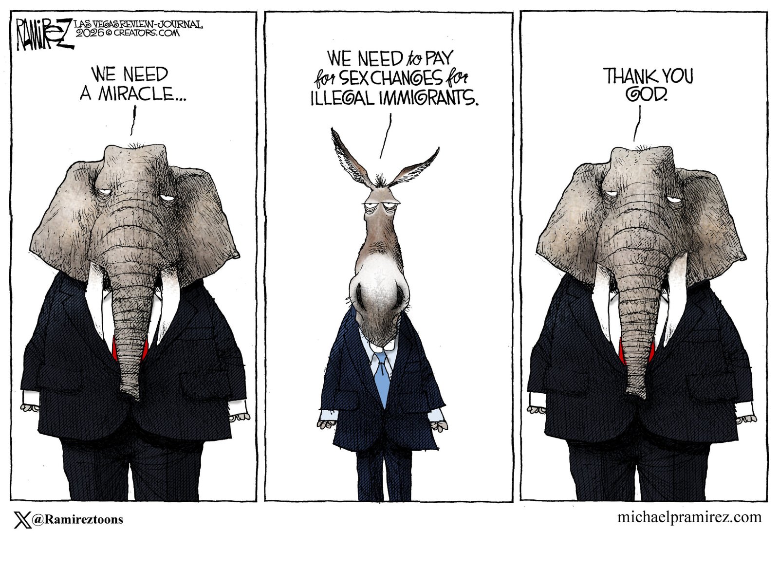 Ramirez, who studied premed at the University of California, Irvine, originally considered journalism a hobby. But he was hooked when his first cartoon for the college newspaper, lampooning candidates for student office, had the student assembly demanding an apology. "Editorial cartoons should be smart and substantive, provocative and informative. They should stir passions and deep emotions. Editorial cartoons should be the catalyst for thought, and frankly speaking, if you can make politicians think, that is an accomplishment in itself. If I don't get at least one death threat every few months, then I'm not doing my job," Ramirez says of his penchant for sparking controversy. In addition to the 1994 and 2008 Pulitzer Prizes, Ramirez was the 2008 winner of the prestigious Fischetti Award. He is a three-time Sigma Delta Chi, Society of Professional Journalism Award winner, a Lincoln Fellow and a recipient of the UCI Medal. He is a senior editor and the editorial cartoonist for Investor's Business Daily. He is formerly the editorial cartoonist for the Los Angeles Times, The Memphis Commercial Appeal and a contributing cartoonist for USA Today. His work is syndicated by Creators Syndicate. Don't leave without checking out his editorial cartoons and Ramirez Caricatures.